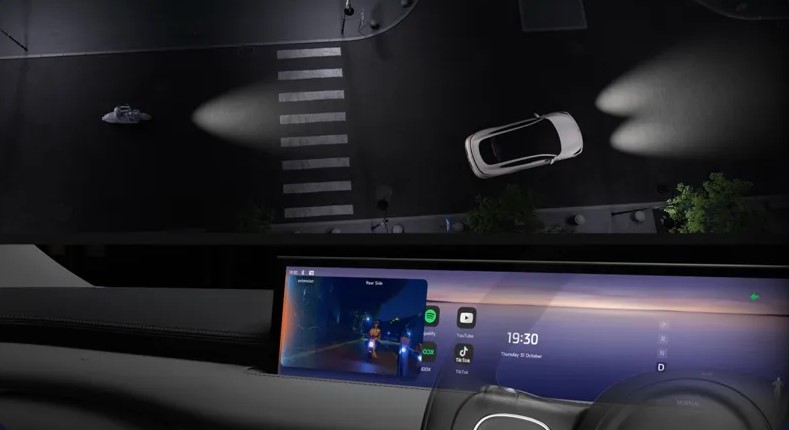 The vehicle’s diagonal, crab-like driving mode enhances maneuverability and driving enjoyment through interactive HMI visuals. It improves parallel parking efficiency by about 90%, reduces required parking space length by 11%, and minimizes both time and steering adjustments needed for precise edge parking.